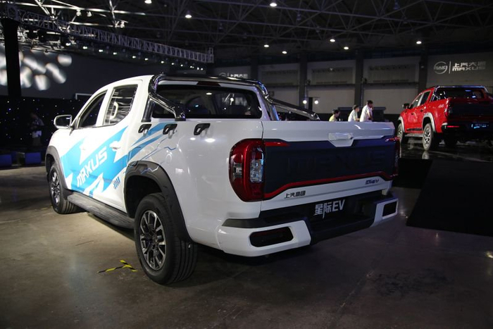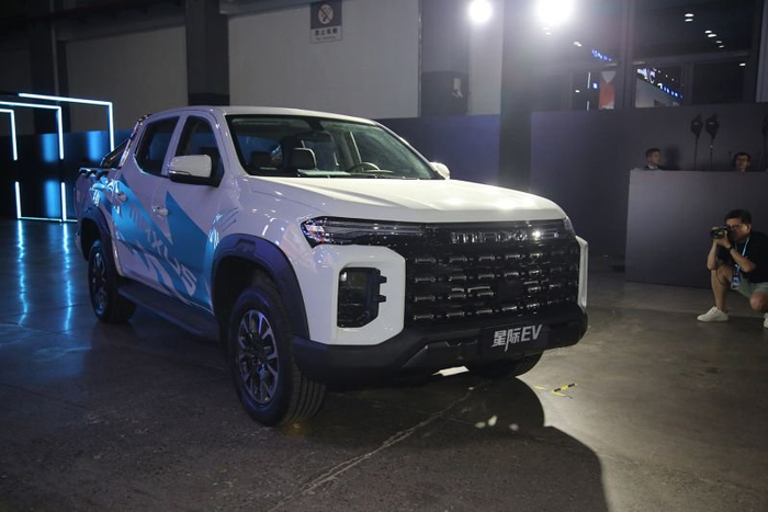 除此之外,星际皮卡这次还推出了纯电动皮卡——星际EV。在外观方面,星际EV并没有采用传统纯电动车型封闭式的前脸设计,反而运用了与燃油版星际H相同的造型,但在车侧的蓝色拉花,以及车尾的右下角可以看的有EV的字样,表明其电动身份。
