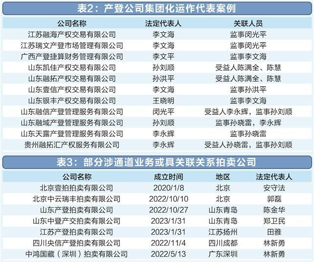 不过,根据记者从所获取理财产品资料及对相关公司关联情况的梳理分析,目前至少已有近十家拍卖公司在从事这一“新业务”。其中,既有成立多年后来入场的拍卖公司,也有集团化运作的伪金交所团队在近期新成立或收购的拍卖公司(表3)。此外,在61家产登公司中,也有8家公司获得了拍卖业务许可。