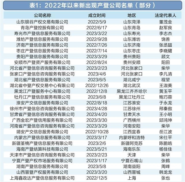 记者在天眼查上通过相关关键词筛选后,不完全统计,仅2022年至今国内就冒出了61家产登公司(表1)。从成立时间上看,有35家公司是在今年上半年注册,说明产登公司的注册速度正在加快。