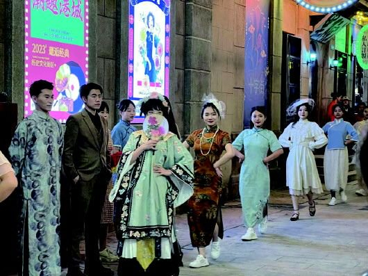 6月29日晚上8时,在位于芝罘区滨海广场的十字街里,剧目《摩登烟台》准时上演,街区里观众摩肩接踵,随着剧情的深入,观众被演员带领着由街北向街南移动,身临其境般回顾烟台开埠史。