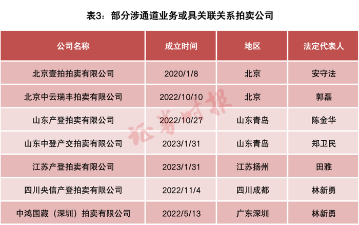 不过,根据记者从所获取理财产品资料及对相关公司关联情况的梳理分析,目前至少已有近十家拍卖公司在从事这一“新业务”。其中,既有成立多年后来入场的拍卖公司,也有集团化运作的伪金交所团队在近期新成立或收购的拍卖公司(表3)。此外,在61家产登公司中,也有8家公司获得了拍卖业务许可。