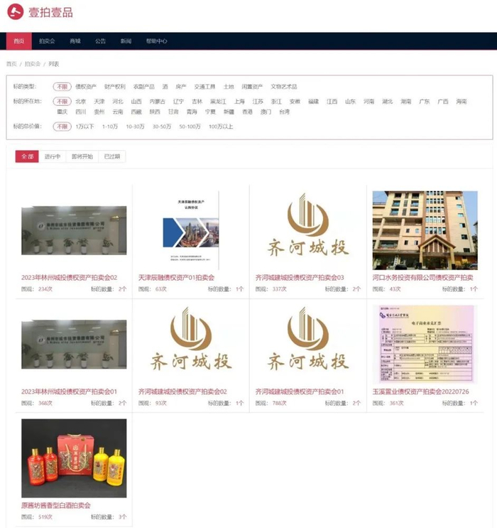 虽然北京壹拍官网上显示的拍卖标的类型丰富,除债权资产外还包括农副产品、酒、房产、交通工具、文物艺术品等,但公开显示的全部9场拍卖会,除一场的拍卖标的是不知名的酱香白酒外,其他8场拍卖会的主角都是像林州城投一样的城投公司,在借此通道违规发行理财产品(图3)。