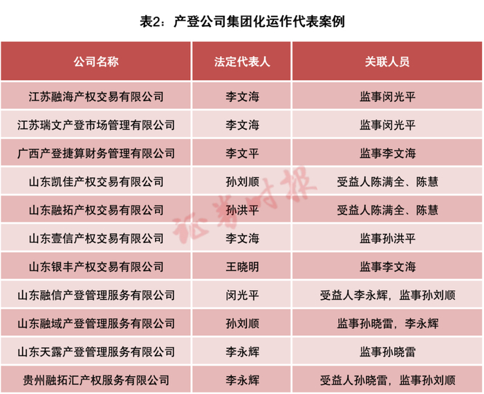 此外,产登公司也如早期伪金交所一样,存在明显的集团化运作模式。记者通过对这些公司相关人员、股东等的梳理分析,发现61家产登公司中至少有40家公司存在集团化运作迹象。
