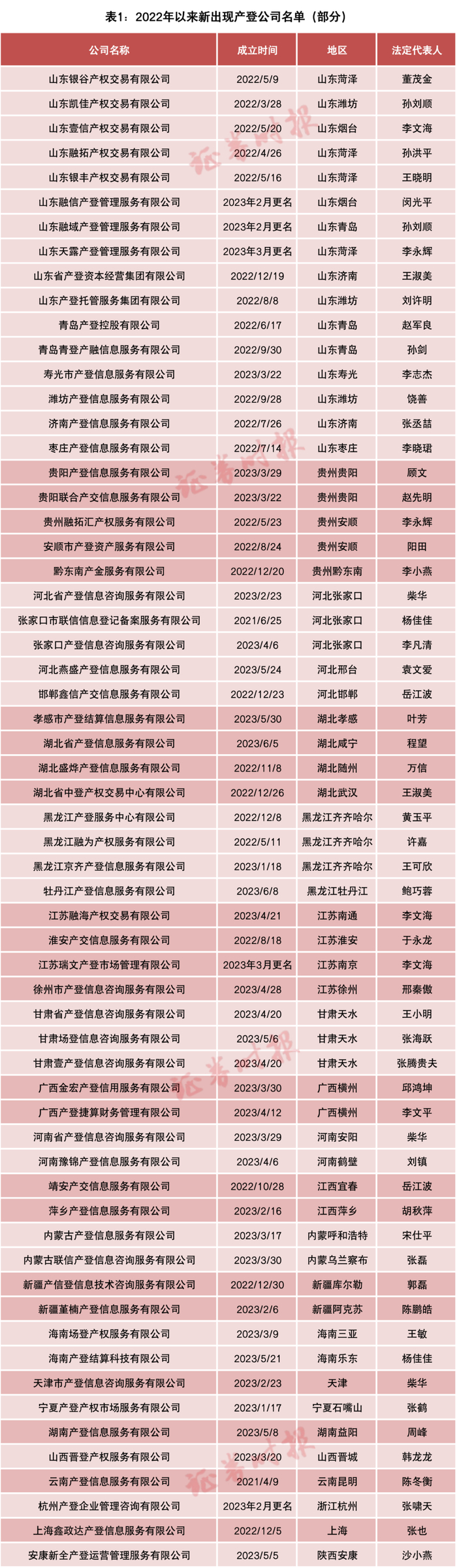 记者在天眼查上通过相关关键词筛选后,不完全统计,仅2022年至今国内就冒出了61家产登公司(表1)。从成立时间上看,有35家公司是在今年上半年注册,说明产登公司的注册速度正在加快。