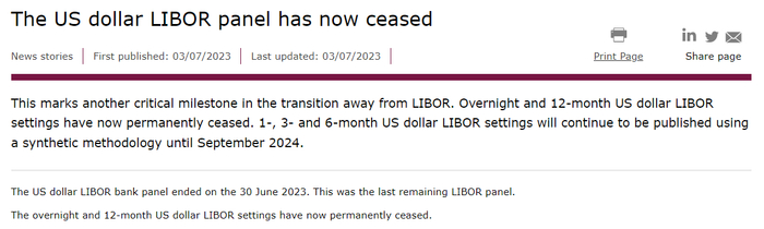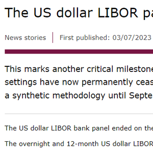 财联社7月4日讯(编辑 潇湘)随着英国金融行为监管局(FCA)周一(7月3日)发布公告称,隔夜和12个月美元伦敦银行同业拆借利率(LIBOR)设置现已永久停止,目前仅剩的最后一个LIBOR银行小组——美元LIBOR银行小组已于2023年6月30日结束运作。这也意味着,过去长达数十年来金融市场的利率定价基准——LIBOR,已正式退出了历史舞台。