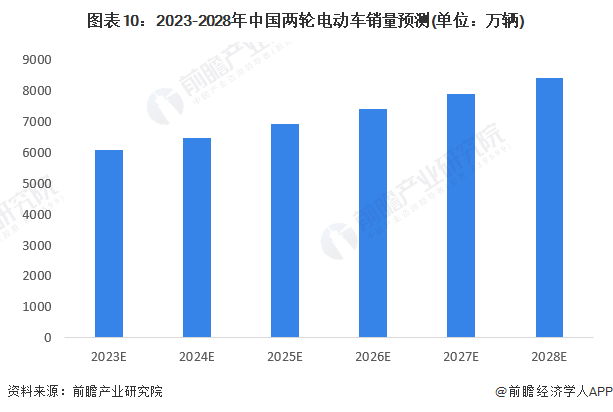 中国电动两轮车的总销量由2017年的3050万辆增长至2022年的6000万辆,复合年增长率超14%。近两年,随着各地两轮电动车的过渡期期限陆续截止,两轮电动车行业换购需求将趋于平缓。秉持着绿色发展、低碳出行的发展宗旨,消费需求升级和电池技术的不断更新,两轮电动车的产品朝着高品质、智能化和个性化的方向发展。前瞻预计,未来中国两轮电动车行业将继续保持增长趋势,但随着电动车换购需求下降和即时配送等行业的逐步饱和,两轮电动车行业的发展增速将会有所下降,前瞻预测2023-2028年中国两轮电动车行业将以7%的复合增长率增长,至2028年,中国两轮电动车销量达8400万辆。