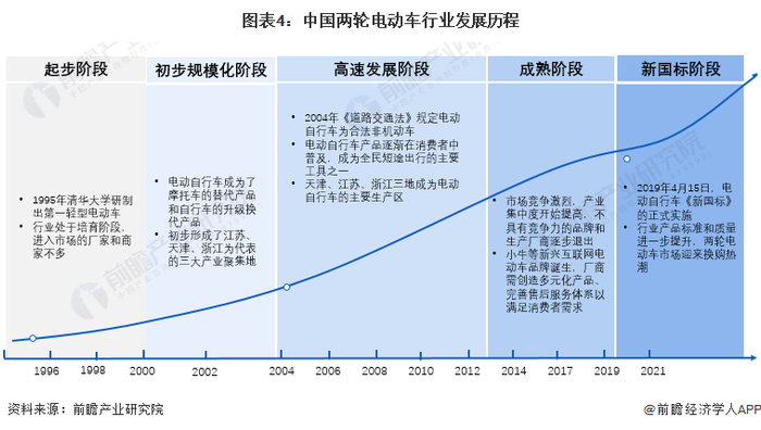 我国两轮电动车起步于20世纪90年代,1995年清华大学研制出第一台柱式无刷直流电机的轻型电动车,标志着我国电动车产业的开端。2000年以来,随着关键技术的突破和整车性能的提升,我国电动车产业进入初步规模化阶段。2004年,《中华人民共和国道路交通安全法》将电动自行车确定为非机动车合法车型,电动自行车得以更广泛地应用,行业进入高速发展阶段。2014年以来,受产业结构调整等因素影响,两轮电动车行业发展速度放缓,同时,小牛等新兴互联网电动车品牌诞生,行业步入成熟阶段,产品多元化发展。2019年,随着《电动自行车安全技术规范》的发布,行业进入新国标阶段,电动车市场迎来换购大潮,产销量及市场规模实现高增。