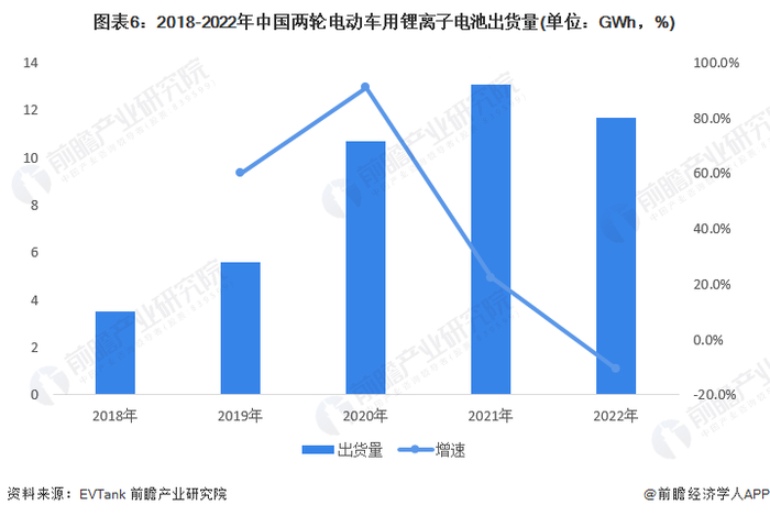 据EVTank统计数据,2018-2021年,中国两轮电动车用锂离子电池出货量逐年增长,2021年中国两轮电动车用锂离子电池出货量达13.1GWh;而2022年首次出现下降,出货量为11.7GWh,故2022年,锂电版两轮电动车的产量为1151万辆,同比减少12.6%,导致其总体渗透率由2021年的24.2%下滑至2022年的19.5%。主要系2022年锂电池价格高涨,厂商为控制成本支出而选择相对便宜的铅酸电池。