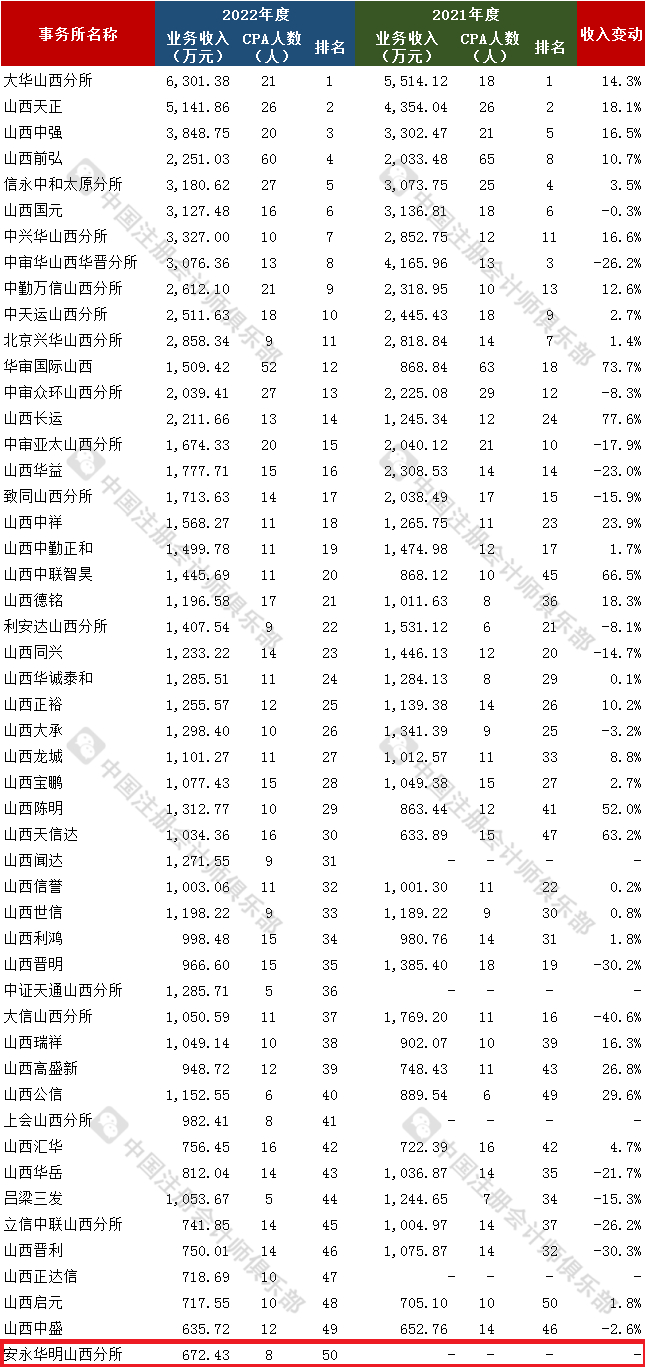 中国注册会计师俱乐部(ID:cicpaclub)梳理的山西省会计师事务所2022年度(公示稿)与2021年度业务收入及排名对比情况如下: