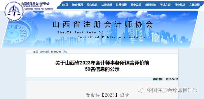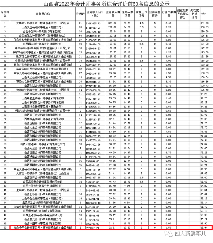 1家“四大”上榜!山西省2023年会计所事务所综合评价前50强公示