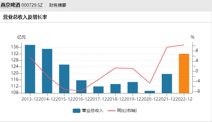 改革之下,掉队的燕京啤酒终于有所起色。2022年,其营收132亿元,同比增长10%,时隔8年重回130亿元的水平。同期,归母净利润3.5亿元,同比增长54.51%。