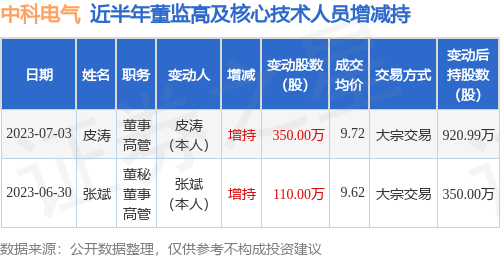 中科电气近半年内的董监高及核心技术人员增减持详情如下: