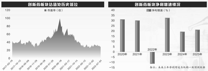 一些龙头的业绩也出现下降趋势,复星医药、恒瑞医药、智飞生物等个股去年净利均同比下降。整体来看,去年创新药板块净利同比下降超11%,逆转了此前连续2年高增长态势。持续回调之下,创新药板块的估值也是一降再降。统计显示,创新药板块最新滚动市盈率不足30倍,处于历史百分位7%。