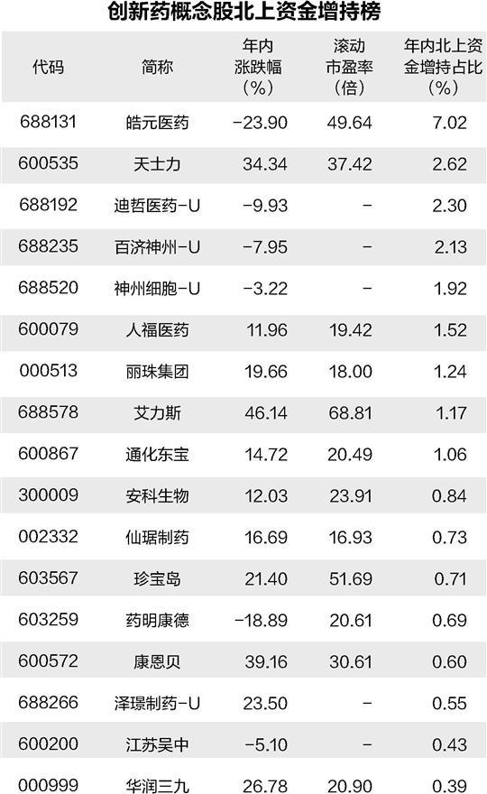 从机构关注度来看,药明康德、智飞生物、凯莱英、恒瑞医药、华东医药等26股获得超10家机构评级,复星医药、通化东宝、仙琚制药等22股获得5家至10家机构评级。在5家以上机构评级个股中,23只个股年内获得北上资金增持,其中皓元医药、天士力、迪哲医药-U、百济神州-U等个股获增持比例均超2%。