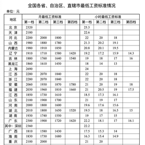 目前,最低工资标准档位最多为四档,辽宁、吉林、安徽、福建、湖北、广东、甘肃、新疆等8省份月最低工资标准和小时最低工资标准分为四档(编注:广东省深圳市单独列出),北京、天津、上海、西藏、青海只有一档。