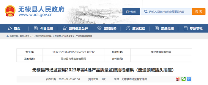 中国质量新闻网讯 近日从山东省无棣县人民政府网站获悉,无棣县市场监管局公布2023年第4批产品质量监督抽检结果(流通领域插头插座)。本期公布合格样品7批次。