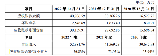 与卓谊生物的营业收入一同走高的还有其应收账款。2020年-2022年,卓谊生物的应收账款余额分别1.65亿元、3.04亿元及4.07亿元,占当期营业收入的比例分别为53.94%、73.05%及76.83%,坏账准备分别为830.91万元、1,673.4万元、2,546.69万元。可以看出,2022年卓谊生物的应收账款余额占营收的比例已经接近八成。也就是说,2022年卓谊生物营收增长1.14亿的同时,应收账款余额也增加了1.03亿元,业绩增长仅仅只是“纸面财富”。