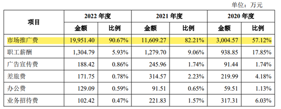 在卓谊生物的销售费用构成中,市场推广费的占比最高,2020年-2022年分别为3,004.57万元、1.16亿元、2亿元,占销售费用的比例分别达57.12%、82.21%、90.67%。三年时间,卓谊生物只卖狂犬疫苗却花费了近3.5亿元的市场推广费。