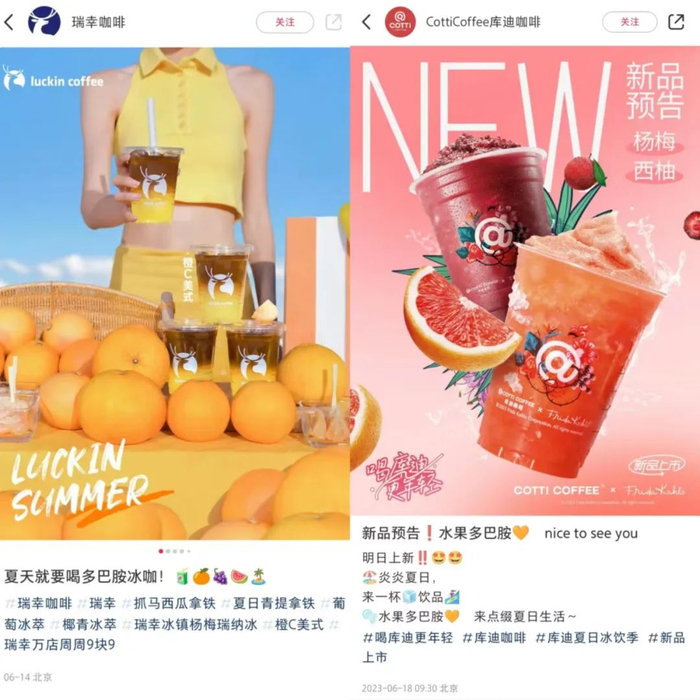 6月中,瑞幸率先推出“多巴胺冰咖”概念,为旗下抓马西瓜拿铁、夏日青提拿铁、橙C美式等产品引流。作为翻版“瑞幸”的库迪,也在几天后打出“水果多巴胺”的关键词,为杨梅、西柚等水果口味的新品提前预热。而在宣传物料上,双方均采用了大面积、高饱和度的水果配色,稳稳拿捏了“多巴胺”风格的精髓。