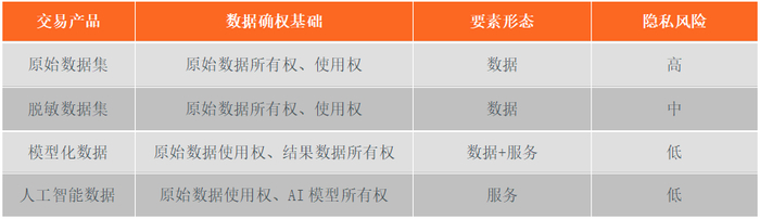 2020年12月,发改委、网信办等四部门发布《关于加快构建全国一体化大数据中心协同创新体系的指导意见》,提出要完善覆盖原始数据、脱敏处理数据、模型化数据和人工智能化数据等不同数据开发层级的新型大数据综合交易机制,确定了数据交易的四种产品形态。