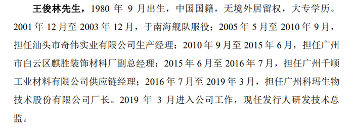 据润本生物招股书披露,赵贵钦( 董事长 )、王俊林( 研发技术总监 )、孙金媛( 研发部工程师 )三位核心研发人员中,只有孙金媛为研究生学历,有研发经历,而作为研发技术总监的王俊林,仅为大专学历。