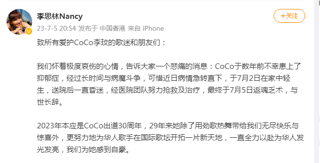 我们怀着极度哀伤的心情,告诉大家一个悲痛的消息:CoCo于数年前不幸患上了抑郁症,经过长时间与病魔斗争,可惜近日病情急转直下,于7月2日在家中轻生,送院后一直昏迷,经医院团队努力抢救及治疗,最终于7月5日返魂乏术,与世长辞。