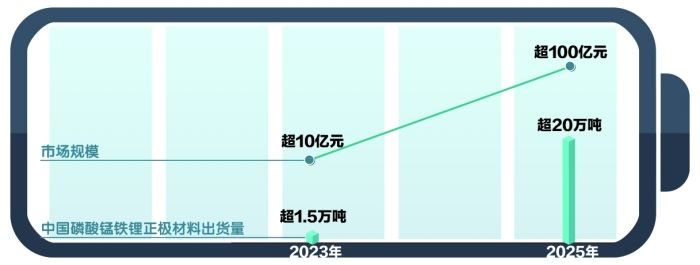 高工产研锂电研究所调研数据显示,随着头部电池企业研发加快,预计2023年中国磷酸锰铁锂正极材料出货量有望超1.5万吨,市场规模有望超10亿元,2025年磷酸锰铁锂正极材料出货量有望超20万吨,市场规模有望超100亿元。