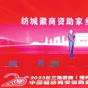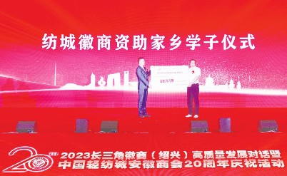(图)近日,“国际纺都·徽动未来”2023长三角徽商(绍兴)高峰论坛暨中国轻纺城安徽商会成立二十周年活动在浙江绍兴举办。图为活动现场举行纺城徽商助力家乡学子仪式。