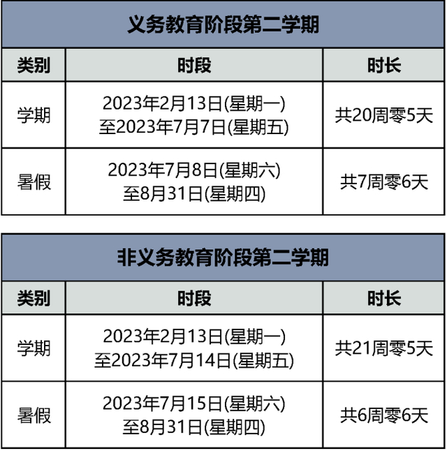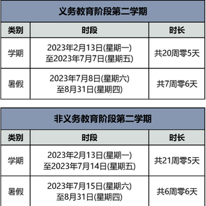 1.义务教育段学校、幼儿园和中职学校。2022学年第二学期于2023年7月3日结束。义务教育段学校期末考试时间为6月28日至6月30日,幼儿园和中职学校参照执行。暑假从2023年7月4日开始,教师原则上于7月6日离校。