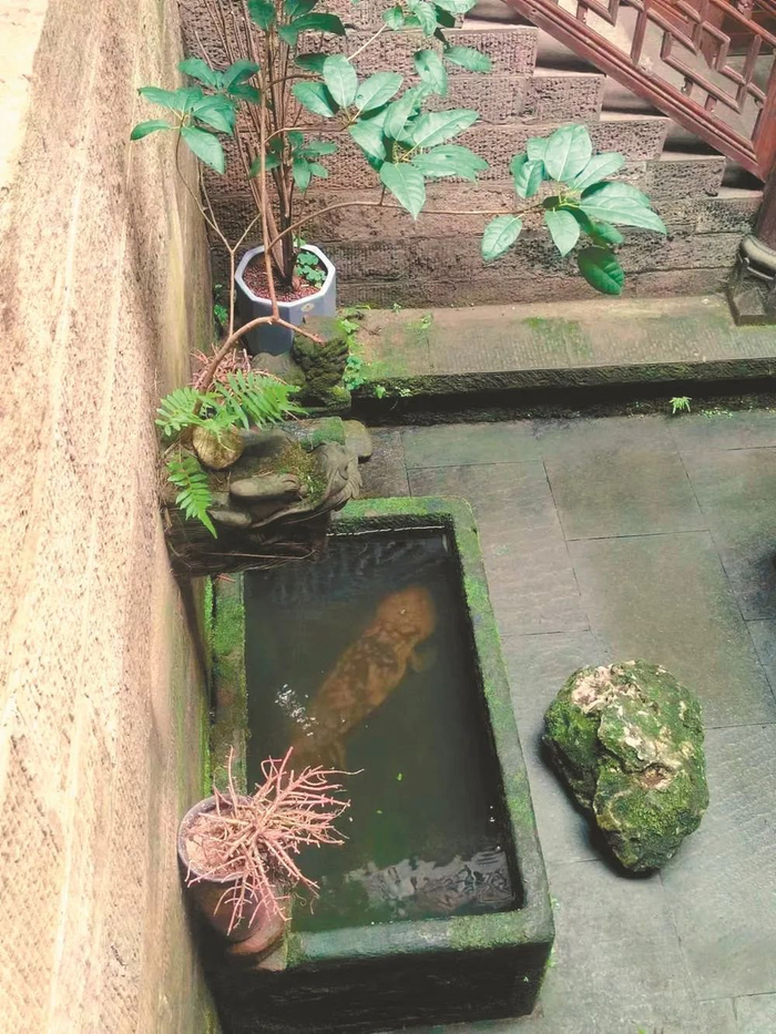 季女士介绍,除了牌匾,还得提到楼宠娃娃鱼。这条娃娃鱼,从一岁的时候住进第一楼,至今有30年了,妥妥的“90后”。她请记者参观的时候悄悄的,不要打扰它睡觉。