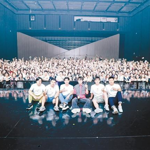 歌手王靖雯(前排左四)在西安演出后与歌迷合影 图片来自王靖雯微博