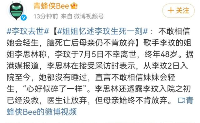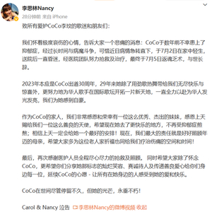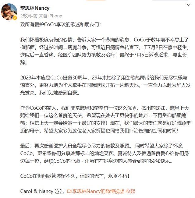昨晚21时,歌手李玟的姐姐李思林在微博发文称:“coco李玟因抑郁症在家中于7月2日在家中轻生,送院后一直昏迷,经医院团队努力抢救及治疗,最终于7月5日返魂乏术,与世长辞。”