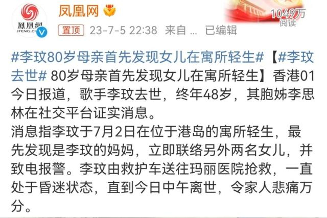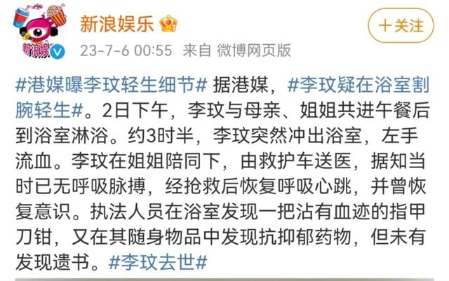 有消息称:李玟于7月2日在位于港岛的寓所轻生,最先发现是李玟的妈妈,立即联络另外两名女儿,并致电报警。李玟由救护车送往玛丽医院抢救,一直处于昏迷状态,直到昨日(5日)中午离世,令家人悲痛万分。