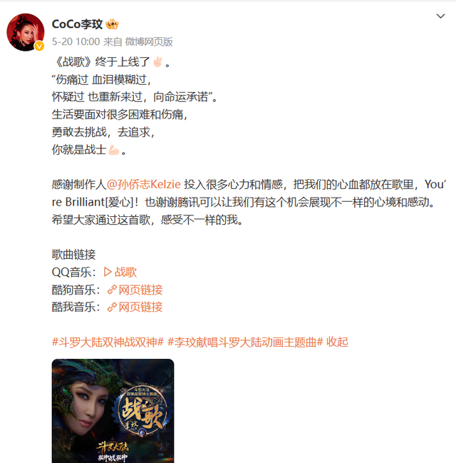 5月20日,李玟最后一条微博曾发布新歌并发文表示:“生活要面对很多困难和伤痛。”
