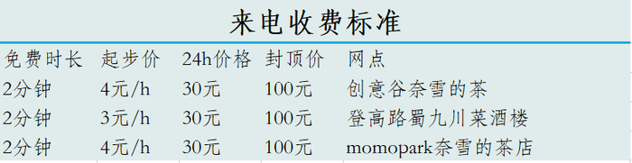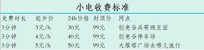在曲江创意谷商场内,两台小电充电宝设备距离不足20米,两者免费时长都在3分钟,但起步价却存在差异,一处为3元/h,一处则为4元/h,24小时封顶价也分别为30元与40元。