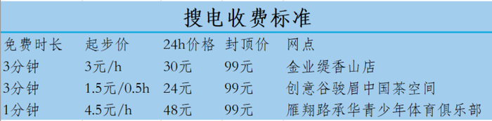 搜电充电宝的免费时长在1—3分钟。起步价在3—4.5元不等,最贵是4.5元,位于一家体育俱乐部内,标注时间也不相同,有的是1小时价格有的是0.5小时价格,24小时封顶价三个点位分别为30元、24元、48元,总封顶价一致为99元。