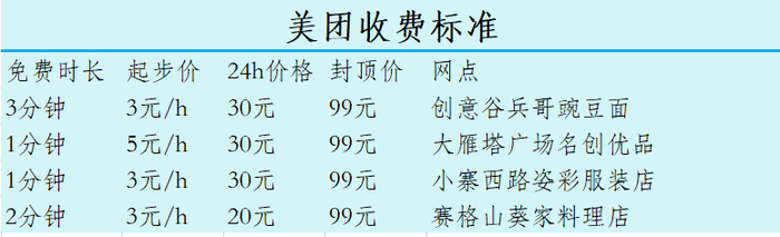 小寨西路姿彩服装店:1分钟内免费,3元/h,24小时封顶30元,总封顶99元。