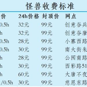 创意谷兵哥豌豆面:3分钟内免费,2元/0.5h,24小时封顶32元,总封顶99元。