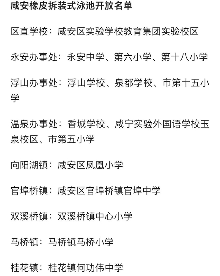为解决暑期防溺水及学生游泳问题,咸安区依次在城区三大街道以及官埠桥镇、横沟桥镇等15所学校率先建成15个橡皮拆装式游泳池,学校周边三年级以上的学生都可提前预约游泳。