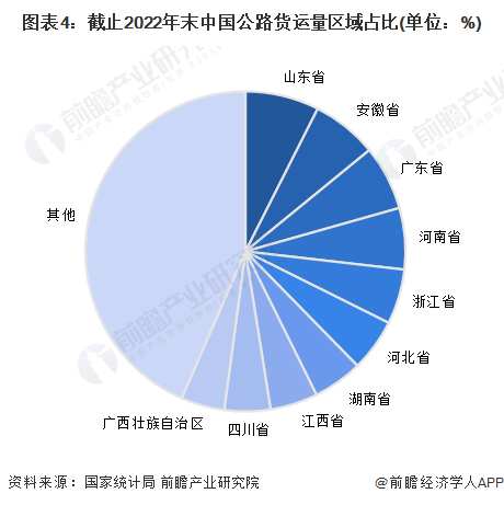 从公路货运量的区域占比来看,我国公路货运量前十位的省份大多位于我国东部,这主要与我国东部经济较为发达,商品贸易流通较为活跃有较大关系,其中,山东以2022年27.69亿吨的公路货运总量位列全国首位。