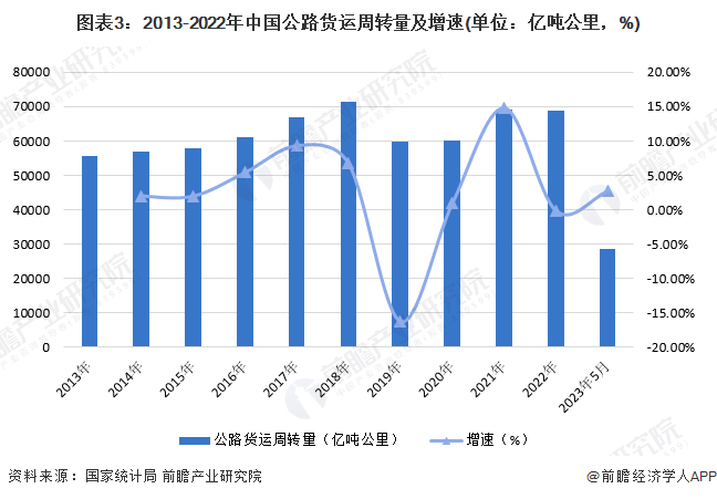 2013-2022年期间,公路货运周转量在波动中总体呈现上涨态势,2019年由于国家出口回落、制造业景气度下滑等原因,公路货运周转量显著下滑,但在2020年逐渐企稳,并在后续回归上升通道,2022年公路货运周转量为68958.04亿吨公里,同比下降0.19%,截至2023年5月,公路货运周转量为28650.67亿吨公里,同比上涨2.7%,总体仍在处在上升通道。