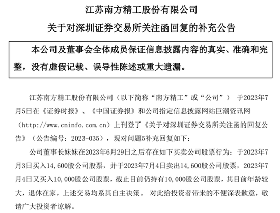 5日晚间,南方精工补充回复深交所关注函称,公司董事长妹妹在2023年6月29日之后存在如下买卖公司股票行为:于2023年7月3日买入14600股公司股票,并于2023年7月4日卖出14600股公司股票,2023年7月4日又买入10000股公司股票,截至目前仍持有10000股公司股票,其目前年龄较大,退休在家,上述交易均系其自主决策。对此给投资者带来的不便深表歉意,敬请广大投资者谅解。