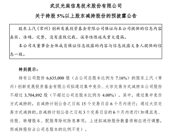 5日盘后,光庭信息发布公告称,公司股东上汽创投因自身资金需求和经营需要,拟通过集中竞价、大宗交易方式减持公司股份不超过370.4892万股(不超过公司总股本的4%)。