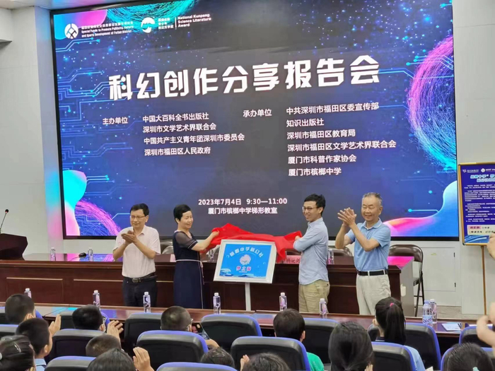 在“科幻创作分享报告会”上,厦门市科普作家协会理事长杨晓剑、厦门槟榔中学校长经丽红分别致辞,槟榔中学多年来致力推动科技教育,为科幻文学教育提供了丰沃的土壤和阳光。本次报告会上,还举行了槟郎中学“梦之海”科幻社揭牌仪式,将致力打造科幻课程、创办科幻杂志等“五个一工程”。