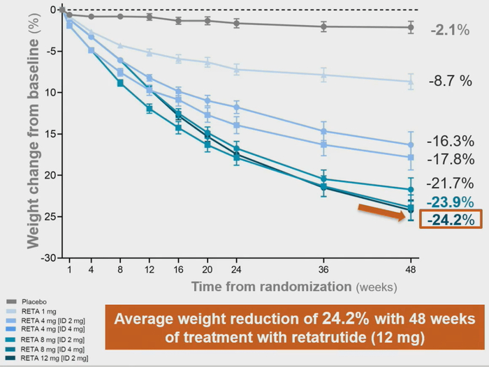 官方数据显示,83%使用Retatrutide(每周12 mg)的肥胖或超重成人患者在经过24周的治疗后,达成至少15%的体重下降;而48周后,患者平均体重减轻24.2%,这个数据战胜了礼来自家的替尔泊肽,再度刷新减肥效果的历史纪录。