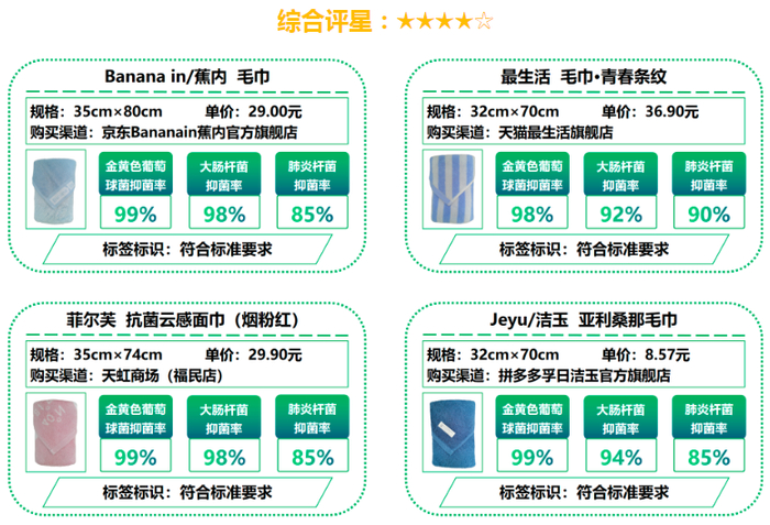 一、总体结果:本次测试的20款抗菌毛巾样品中,有4款样品综合表现卓越,获评五星,分别为恒源祥、全棉时代、金号、内野品牌样品。