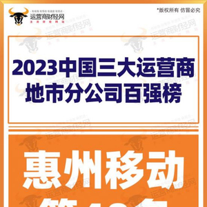 在“2023中国移动地市分公司33强榜”中,惠州移动的营收规模位列第27名,也是广东移动旗下仅次深圳移动、广州移动、东莞移动、佛山移动之后的省公司第五大地市分公司。