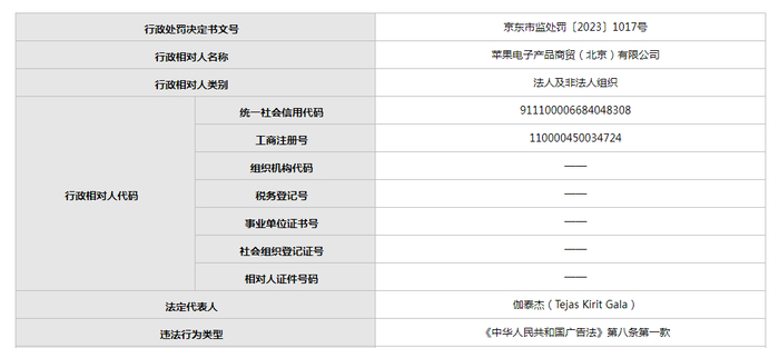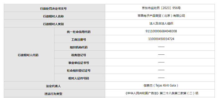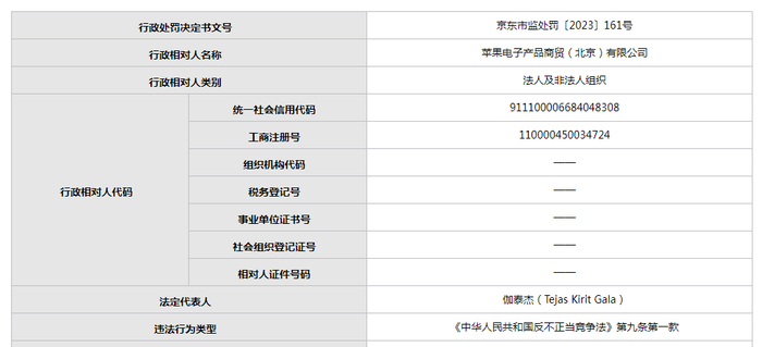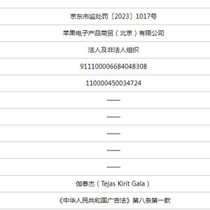 苹果电子产品商贸(北京)有限公司再被罚 两个月三次违法累计罚款金额33万元