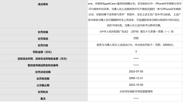 据北京市市场监督管理局网站,因违反《中华人民共和国广告法》第八条第一款,苹果电子产品商贸(北京)有限公司被罚款3万元,处罚机关为北京市东城区市场监督管理局。这是该公司今年收到的第三张罚单,处罚依据均为广告法相关规定,三次罚款总额达到33万。