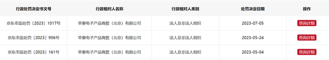 在这张罚单之前,苹果电子产品商贸(北京)有限公司在5月份连续收到了两张罚单。